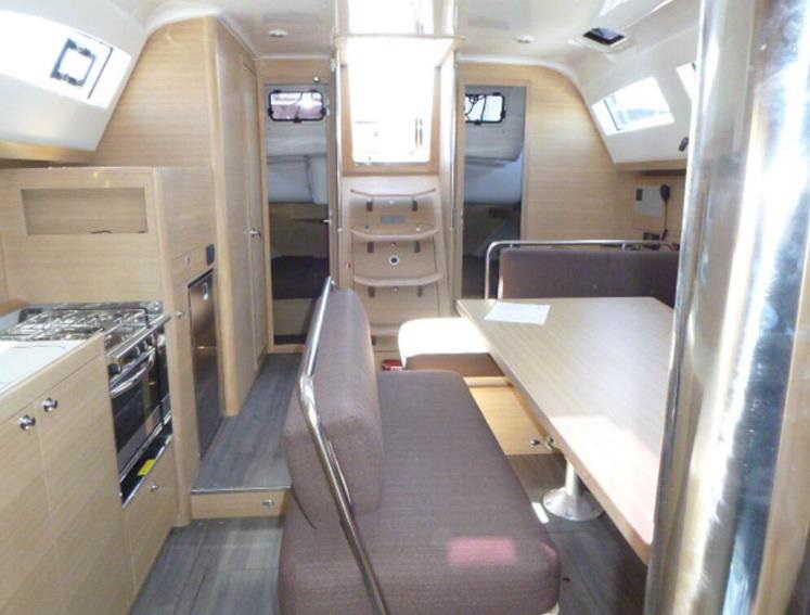 Komfort zapewni przestronna mesa (przestrzeń gościnna pod pokładem) z kambuzem (jachtową kuchnią), toalety wyposażone w prysznic.